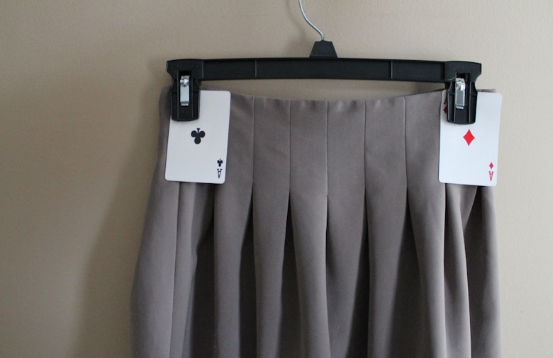 I actually had to come across this idea the hard way. I didn’t understand why there were always dents in my skirts. Whenever I would get to work, I’d have to spend the whole day trying to hide them from the public eye. Turns out, the dents were from my hangers. Use playing cards, or a couple of index cards, to protect your skirts.