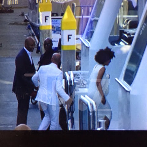 In the two-minute clip, Beyoncé’s husband Jay Z can be seen departing a black car while sporting an all white suit. It was clearly a family affair as after Jay Z exited the automobile, a little boy in an orange T-shirt jumped out and walked ahead of him into a plaza. The unidentified street looked is if it could’ve been located near a harbor with ship docks. A black Range Rover was behind the rapper’s car on the street and it appears the vehicle was transporting other family members, as Tina and Beyoncé’s glamorous entourage were all captured on film entering the plaza in dazzling attire.