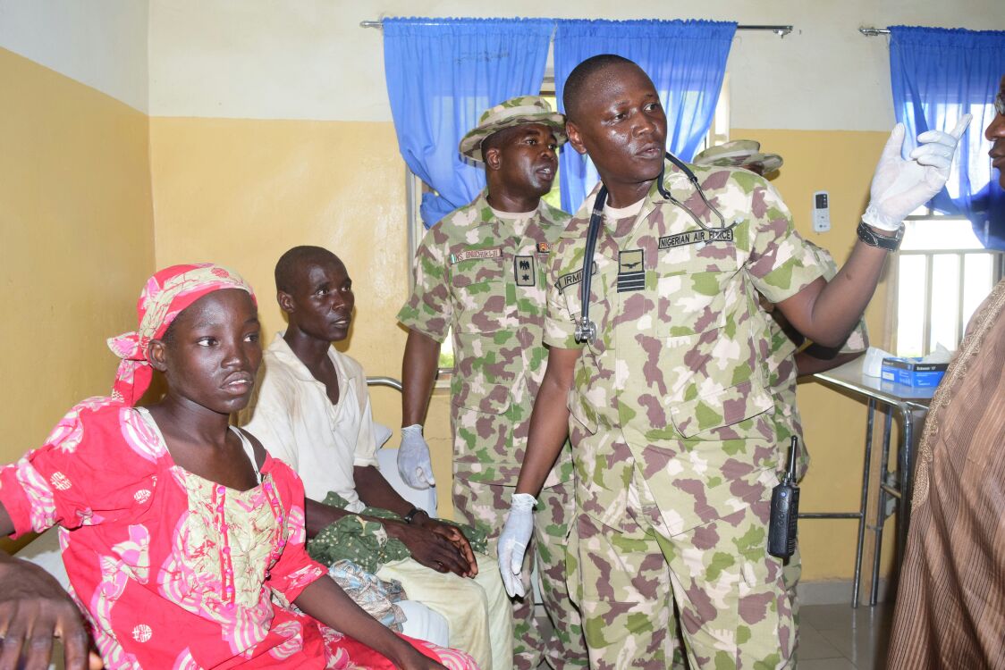 The rescued Chibok school girl, Amina Ali, was airlifted by Nigeria Air Force Super Puma aircraft from Damboa to Maiduguri alongside her baby and supposed husband, Mohammed Hayatu. Prior to that they were examined at Air Force medical facility and were found to be stable and normal blood pressure was observed. Thereafter, she was released to the Operation LAFIYA DOLE headquarters for further investigation and handing over.