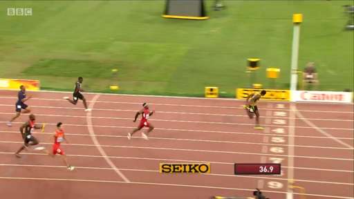 Usain Bolt crossed the line in 37.36 seconds. USA finished in 37.77 seconds but were disqualified. China therefore finished with silver in 38.01 seconds.