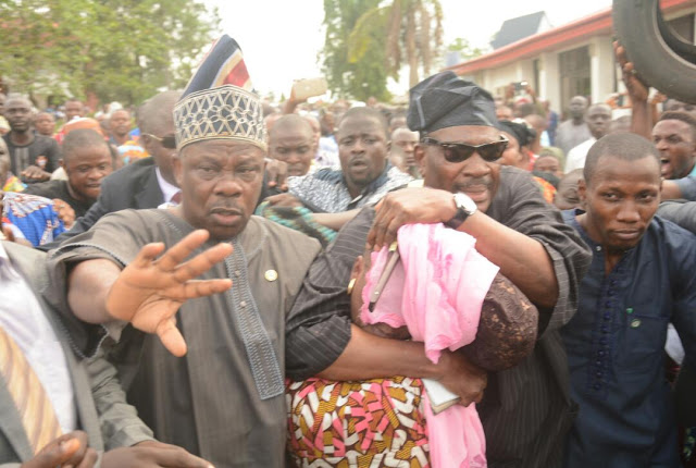 Ibikunle Amosun, the governor of Ogun State, played the role of a knight in armour to a female commissioner designate, Ms. Idiat Babalola, in Osun State at the funeral of Senator Isiaka Adeleke after an angry mob attacked her.