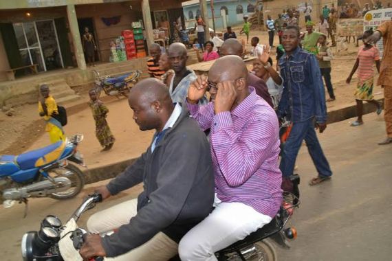 Governor Ayodele Fayose of Ekiti State rode on a motorcycle popularly referred to as Okada on Thursday, February 25, 2016 during an inspection of the water projects which he recently installed in Aramoko Ekiti in Ekiti West LGA of Ekiti State.
