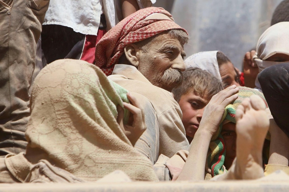 Yazidis fleeing violence ride in the back of a truck toward the Syrian border. (Photo Credit: Rodi Said / Reuters)
