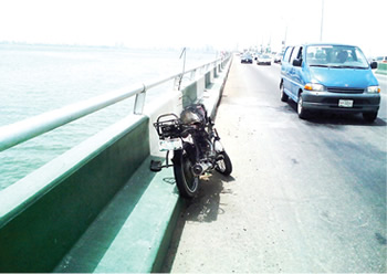 A policeman on a motorcycle was burnt to death in a lone crash that happened at the UNILAG waterfront end of the Third Mainland Bridge, Lagos State in the early hours of Tuesday, March 24, 2015.
