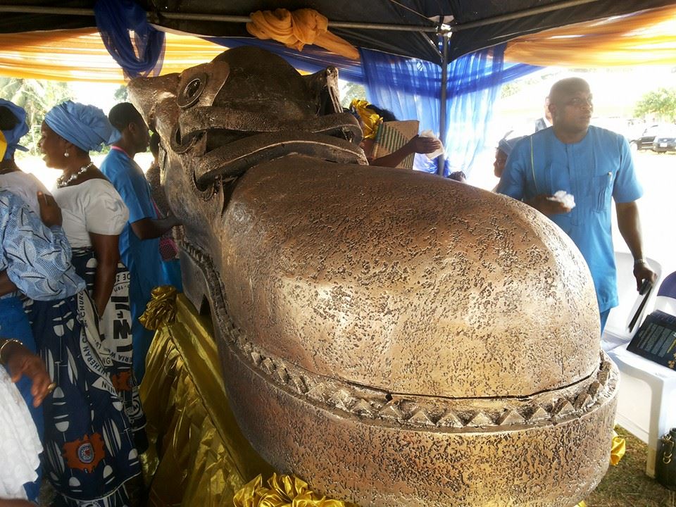 The photos, sent to us by a reader, Emmanuel Emmanuel Udoh, shows a casket in the shape of a golden shoe. Great art work on display.