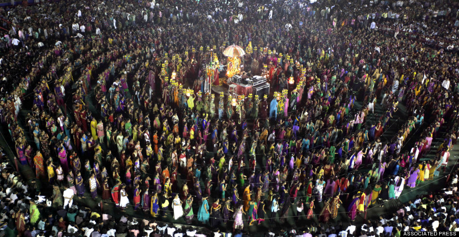 In this Saturday, Oct. 12, 2013 photo, Indian devotees dance around Hindu deity Umiya Mata temple on the eighth night of Navratri in Surat in the western Indian state of Gujarat. Every year thousands of devotees participate in this ritual, where they pray to nine different forms of Hindu Goddess Durga. (AP Photo/Ajit Solanki)