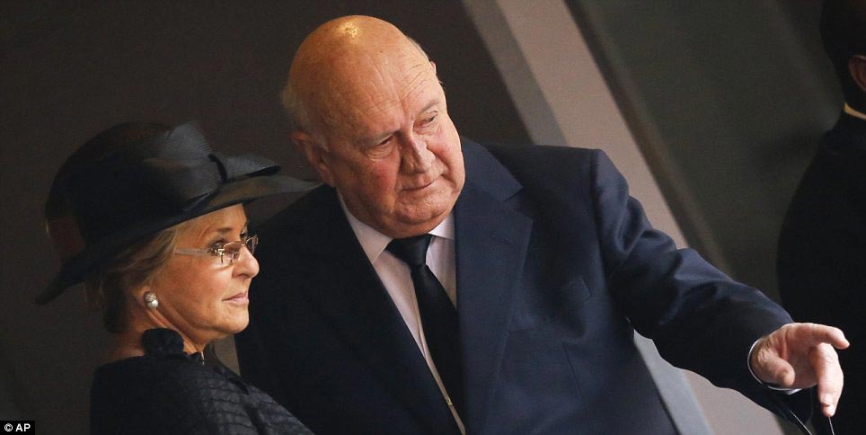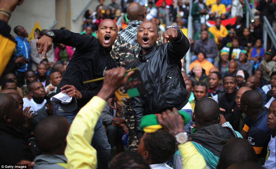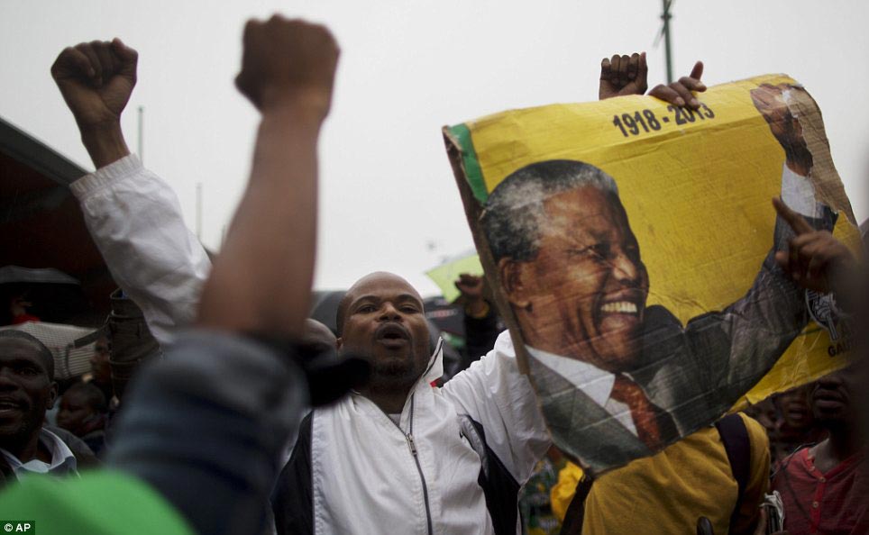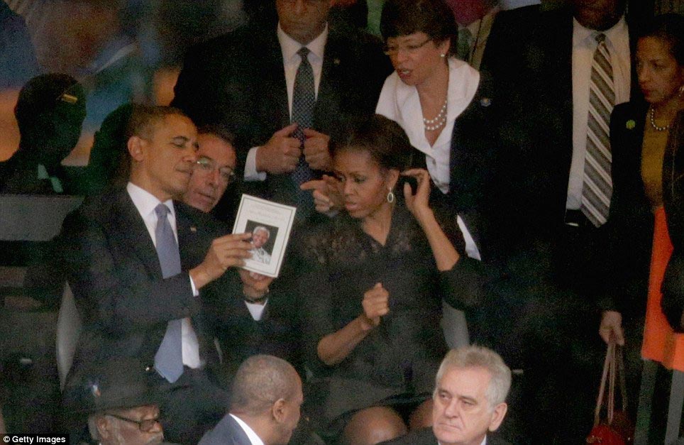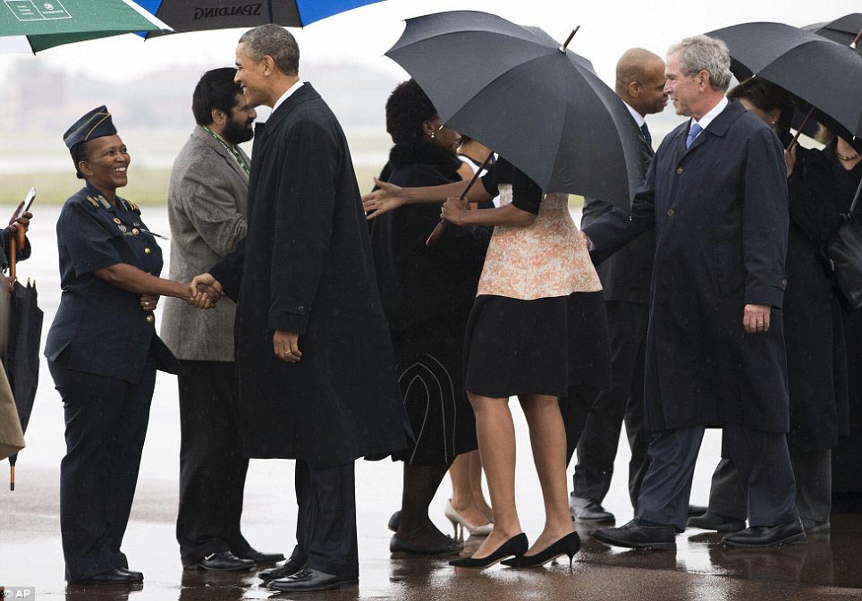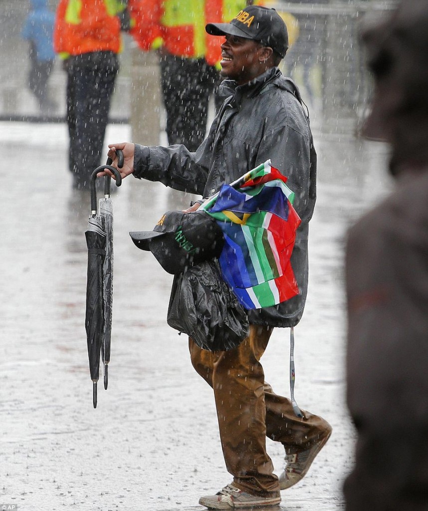 Colourful: A woman dressed in the regalia of the South African national rugby team arriving at the stadiumThe highest spots: Spectators gather ahead of the Tuesday memorial ceremonyCelebration: A mourner wearing a wig in the South African national colours arrives at the stadiumUnity: Mandela is loved by South Africans for his efforts to transform the racially divided country into the ‘Rainbow Nation’Dance: Many of those inside the stadium were dancing to celebrate the life of the former leaderHero: Mandela’s death has united South Africa in mourning for the past five daysDrizzle: But mourners were not deterred by the rain in Johannesburg as they arrived at the stadiumCarnival atmosphere: Even before the start of the service thousands had gathered to celebrate the life of the former presidentPassion: The huge number of mourners at the ceremony is testimony to the impact Mandela made on his countryUnity: Mandela is loved by South Africans for his efforts to transform the racially divided country into the ‘Rainbow Nation’Father of the country: Many, like this little boy, refer to the former president using his tribal name, MadibaPolitics: A supporter waves the flag of the African National Congress, the liberation movement which became Mandela’s political partyBanner: Supporters carrying a large sign which paid tribute to Mandela’s lasting legacy in South Africa and the rest of the worldQueues: Members of the public clutching umbrellas to protect against the rain file in to the stadium in SowetoGetting ready: Crowds have been piling up around the First National Bank stadium where Mandela’s memorial service will be held on TuesdayPrepared: People filled the stadium on Tuesday hours before the dignitaries arrivedReady to celebrate: It has been five days since the 95-year-old former President diedFestive: Men singing in the queue for the ceremony at South Africa’s largest football stadiumPaternal: Mandela was often known at ‘Tata’, or ‘Father’, by South Africans grateful for his legacyFilling the seats: The stadium, dubbed ‘Soccer City’, holds 90,000 but there have been overflow areas planned in advance as organizers are worried about an unruly turn outDownpout: The rain did not deter the good-natured crowds and provided a business opportunity for entrepreneurial bystandersHis final appearance: It was in ‘Soccer City’ in 2010 where former President Mandela was last seen publicly before he stopped going to large events due to his ailing healthInspiration: 14-year-old Thomas looks out across the arena as the crowds start to file in for the memorial serviceProgramme: The events were scheduled to include talks by world leaders as well as tributes from Mandela’s familySuccessor: Former South African President Thabo Mbeki (left) is welcomed as he arrives at the FNB StadiumSuccessor: Former South African President Thabo Mbeki inside the venue with his wife Zanele (right)Outside: A mourner holding a South African flag on the outskirts of the FNB Stadium this morningUganda’s President Yoweri MuseveniMalawi’s President Joyce Banda (right) arrive at WaterkloofEquatorial Guinea’s president Teodoro Obiang Nguema Mbasogo arrived in South Africa on Monday nightKenya’s President Uhuru Kenyatta also arrived on Monday nightWelcoming committee: President Obama and Michelle (who is covered by an umbrella) are greeted Tuesday morning on the tarmac in Johannesburg by International Relations Minister Maite Nkoane-Mashabane (center)Touching down: President Obama and First Lady Michelle looked collected and sombre after coming off the 17-hour flight on Air Force OneJovial: Former UN Secretary-General Kofi Annan (left) and retired Anglican Archbishop Desmond Tutu appear in good spirits as they arrive for the serviceRespected: Former UN Secretary General Kofi Annan arrived with Archbishop Desmond Tutu and former President Jimmy CarterStars: U2 singer Bono and South African actress Charlize Theron talking in the crowd at the ceremonyLines of succession: Obama led the Americans, followed by Michelle, then former President George Bush, Laura Bush, and Hillary Clinton seen just slightly at the endFormer President George W. Bush and his wife Laura are seen coming off of Air Force One after the Obamas as the two couples shared the plane with former Secretary of State and first lady Hillary ClintonEmbraced: Former British Prime Minister Tony Blair (left) is greeted after arriving for the memorial service in JohannesburgSense of humour: Former President of Ireland Mary Robinson (left) chats with Archbishop Emeritus Desmond Tutu arrive inside the FNB stadiumSpringboks: South Africa’s rugby captain Jean de Villiers and his predecessor Francois Pienaar were among the mournersUnited: When Mandela handed the rugby world cup to Pienaar it was considered a landslide moment in the post-apartheid eraMourning: Mr Mandela’s former wife Winnie Mandela Madikizela (centre), who famously greeted her husband as he left prison, arrives at the ceremonyNot attending: Russia’s president Vladimir Putin today signed a book of condolence for Mandela’s death at the South African embassy in MoscowZimbabwe President Robert Mugabe and his wife Grace Mugabe (centre) arrive in Pretoria ahead of the memorialControversial: Reviled Zimbabwean President Robert Mugabe is questioned by reporters as he makes his way into the stadiumFamily affair: (front row) Mr Mandela’s daughters Zindzi, Zenani and Makaziwe Mandela, ex-wife Winnie Mandela Madikizela and widow Graca Machel before the serviceRelatives: Mr Mandela’s ex-wife Winnie Mandela Madikizela (left) and his widow Graca Machel (far right) take their seats in the stadiumPakistani President Mamnoon Hussain (centre) is also on the guestlist for the prestigious memorialSuccessor: Jacob Zuma, the current president of South Africa, gave the keynote speech during the ceremonyAlly: FW de Klerk, who was awarded the Nobel Prize along with Mandela for his role in en