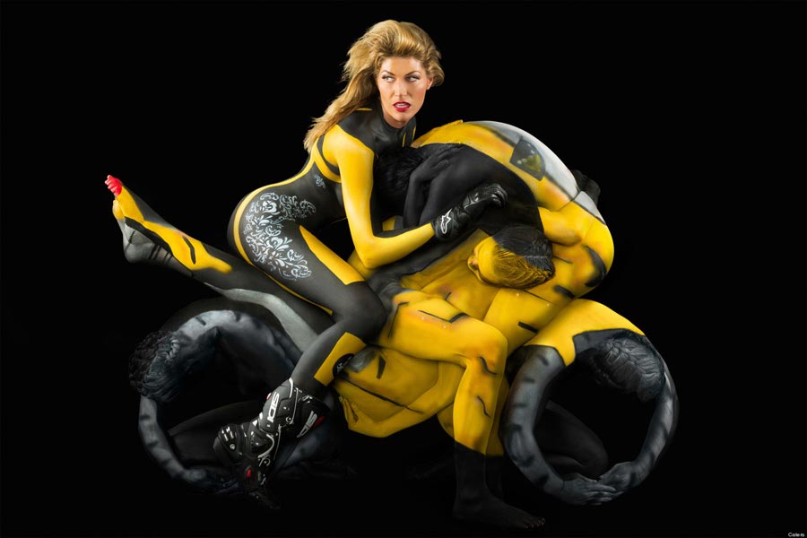 Even though body painters have switched their artistic medium from stiff canvas to more elastic skin, that does little to change the artist’s need for a stable, sturdy surface. With that in mind, artist Trina Merry aptly selects athletic models for her human sculpture/painting works. It’s not just for aesthetics; all models must be able to hold an often awkward and uncomfortable position for hours on end.