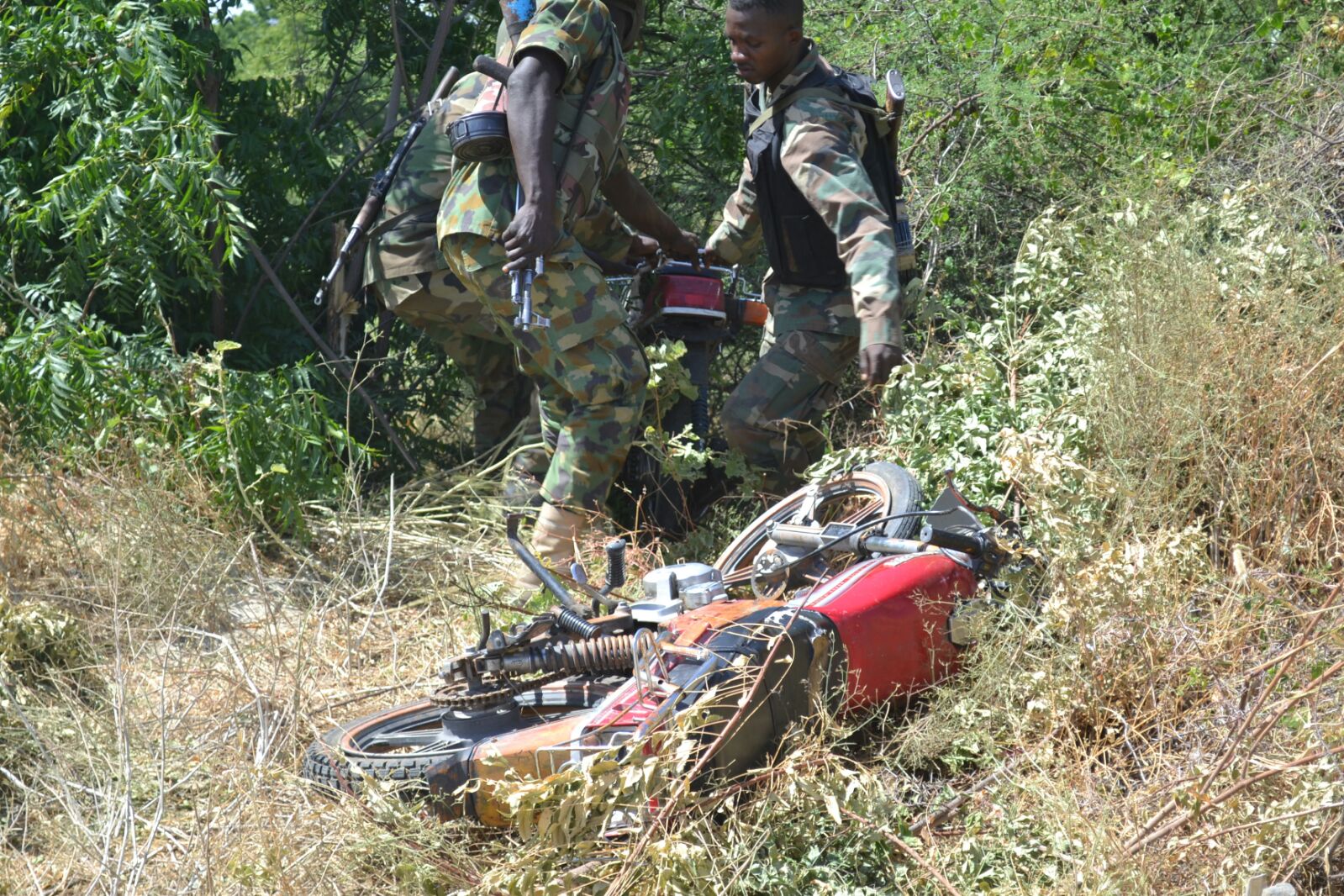 In efforts to continually dominate recovered territories and clear all Nigerian territory of Boko Haram vestiges, the advancing troops of 5 Brigade Task Group have today cleared 5 more terrorists camps at Hausari and Baranga in Marte Local Government Area of Borno State. The troops during and encounter with Boko Haram terrorists at the camps killed 2 terrorists and recovered 2 Dane guns and a Double Barrel gun, while 12 motorcycles abandoned by some fleeing terrorists were destroyed. In addition, a suspected female member of the terrorists group was captured and is currently undergoing interrogation.