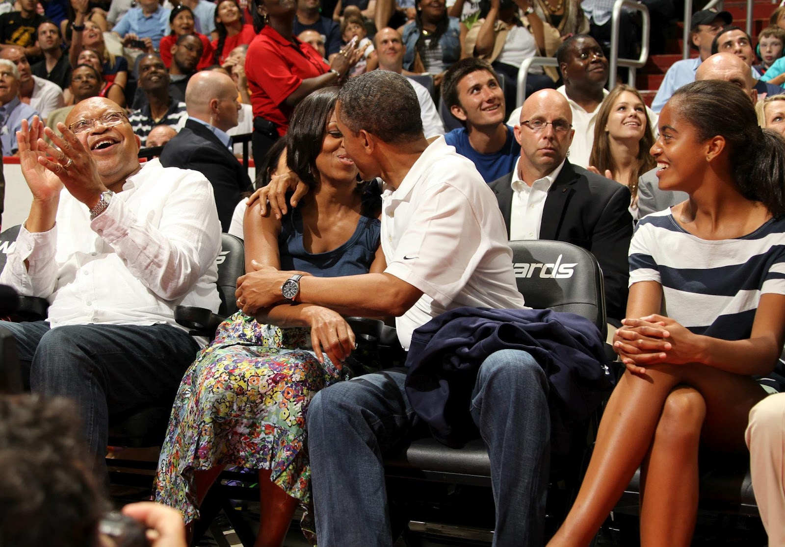 July 16, 2012 “The President and First Lady were attending the game between the U.S. Men’s Olympic basketball President Barack Obama and Brazil in Washington, D.C. During the first half, the jumbotron flashed couples on their ‘Kiss Cam’, where they are then induced by the crowd to kiss each other. But neither the President or First Lady saw themselves when they were flashed on ‘Kiss Cam’, and some in the audience booed when they didn’t kiss. At halftime, as we walked to the locker room to visit the U.S. team, daughters Malia and Sasha were asking their parents why they hadn’t kissed during their ‘Kiss Cam’ moment. Both the President and First Lady said they hadn’t even realized what had happened and didn’t know why people were booing. So in the second half, when they appeared again on the ‘Kiss Cam’, the President leaned over to kiss the First Lady amongst audience cheers as Malia and the Vice President watched overhead on the jumbotron.” (Official White House Photo by Pete Souza)President Barack Obama kisses the head of first lady Michelle Obama after kissing her for ‘Kiss Cam’ while attending the Olympic men’s exhibition basketball game between Team USA and Brazil, Monday, July 16, 2012, in Washington. Team USA won 80-69. (Photo Credit: AP Photo/Alex Brandon)President Barack Obama and First Lady Michelle Obama pretend to march to music in the Blue Room of the White House, July 4, 2010, before delivering remarks to military families during a Fourth of July celebration. (Official White House Photo by Pete Souza)President Barack Obama kisses First Lady Michelle Obama after speaking about health care at a joint session of Congress, Sept. 9, 2009. (Official White House Photo by Pete Souza)