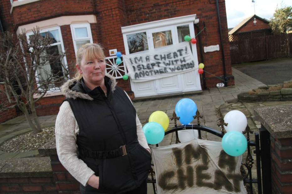 As if that was not enough, the cleaner, Lynn Bennett, 43, from Goole, East Yorkshire, United Kingdom also hung up multi-coloured party balloons to ensure that the sign caught the attention of a handful of passers-by and make the man feel really embarrassed.