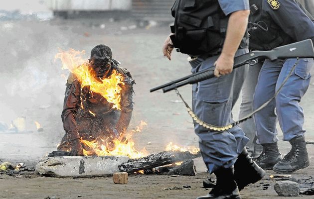 Nhamuave after police doused the flames consuming his body. Sixty-two people died during the wave of xenophobic attacks in 2008, an orgy of violence directed at foreigners. (Photo Credit: Halden Krog)